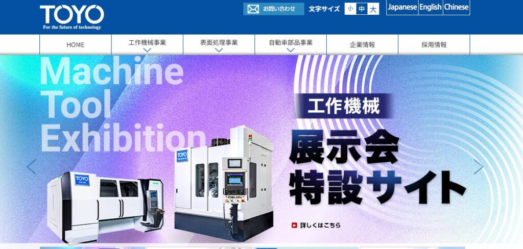 マツダ・伊藤忠商事グループに属する工作機械・自動車部品・表面処理のメーカーで、特に内面研削盤分野で国内トップクラスのシェアを保有します。歯車研削盤をはじめ、内外径研削盤やホーニング盤など精密研削・仕上げ加工機を幅広く展開し、「内研のTOYO」として自動車部品・軸受・コンプレッサ部品などの高精度加工を支えています。近年は半導体・パワー半導体向け装置やIoT連携ソリューションにも注力しています。