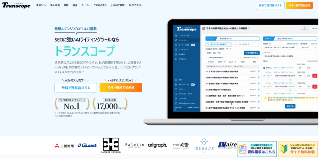 シェアモル株式会社が運営するトランスコープは、SEOに強いAIライティングツールです。