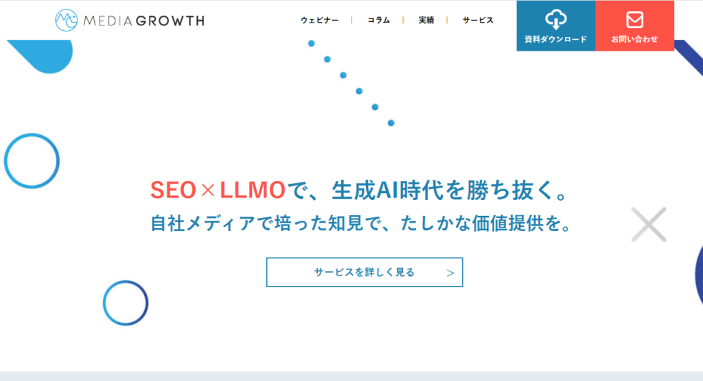 株式会社メディアグロースは、東京都新宿を拠点に SEO コンサルティングを中心とした Web マーケティング支援を提供する企業です。SEO 内部・外部・コンテンツ対策、被リンク獲得支援、生成 AI 検索最適化(LLMO)などの施策を組み合わせ、Web 集客の最大化を支援しています。各施策ではキーワード設計やコンテンツ制作を含めた提案を行い、分析結果をもとに改善施策を提示します。また、企業規模を問わず幅広いクライアントの支援実績があり、自社メディア運営で培った知見を活かした SEO 施策を提供しています。