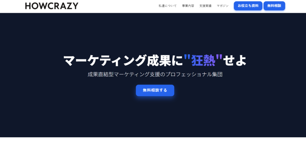株式会社ハウクレイジーは、戦略設計からサイト構築、集客運用までを一気通貫で支援するマーケティング会社です。コーポレート/EC/LP制作に強く、SEOとUI/UX、コアウェブバイタル最適化、アクセシビリティ、セキュリティに配慮した高速表示を実現します。CMSやMA・CRM連携、データ分析に基づく改善で成果を継続的に最大化します。BtoBリード獲得からEC売上向上まで、コンテンツ制作、広告運用、CRM施策まで伴走します。中小から上場企業まで業種横断で対応し、迅速納期と透明見積で安心して任せられます。